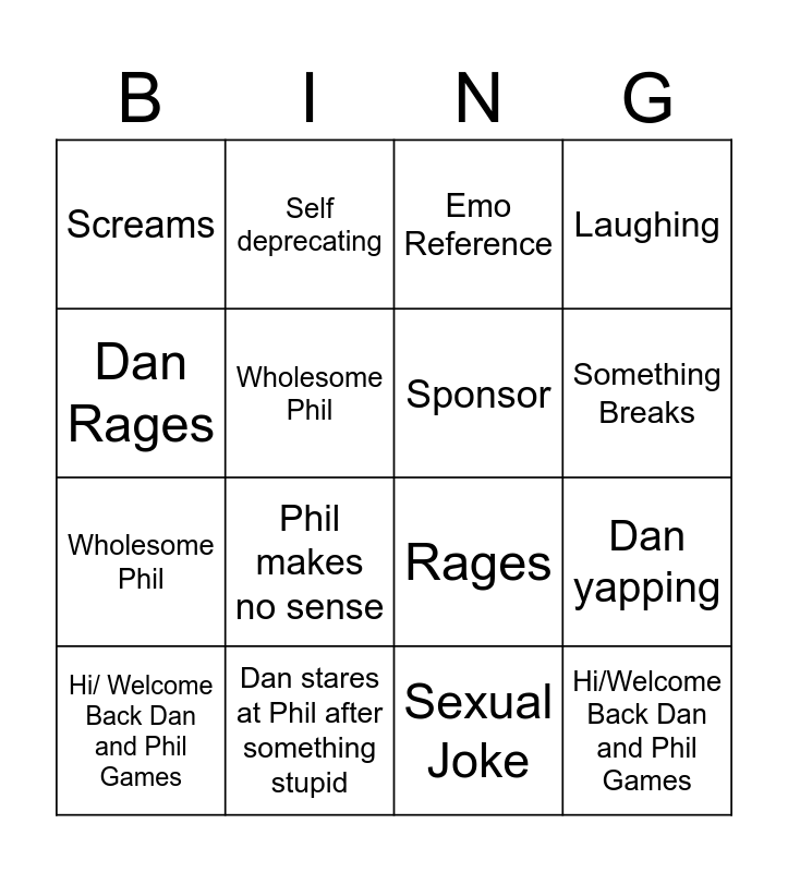 This bingo card has 20 words: Hi/ Welcome Back Dan and Phil Games, Gay, Emo Reference, Dan yapping, Making fun of each other, Phil makes no sense, Sexual Joke, Laughing, Wholesome Phil, Self deprecating, Rages, Something Breaks, Screams, Dan stares at Phil after something stupid, Sponsor, Object Cameo, Dan Rages, Wholesome Phil, Emo reference and Hi/Welcome Back Dan and Phil Games.