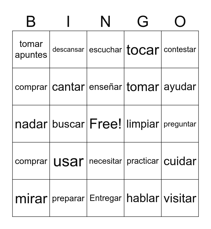 This bingo card has a free space and 32 words: hablar, bailar, buscar, caminar, comprar, cantar, contestar, cuidar, descansar, dibujar, enseñar, escuchar, estudiar, participar, limpiar, llevar, mirar, nadar, necesitar, usar, practicar, pintar, preguntar, preparar, visitar, tocar, tomar, comprar, tomar apuntes, Entregar, trabajar and ayudar.