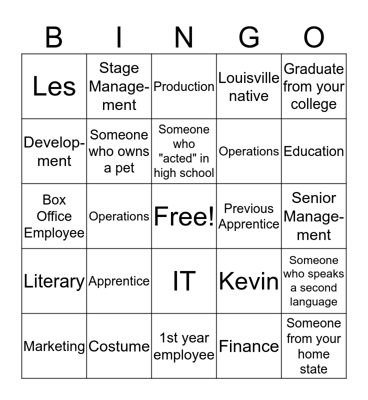 This bingo card has a free space and 24 words: Apprentice, Costume, Someone who "acted" in high school, Marketing, Graduate from your college, Les, Develop-ment, Stage Manage-ment, Previous Apprentice, IT, Operations, Box Office Employee, Kevin, Someone who speaks a second language, Someone who owns a pet, Finance, Senior Manage-ment, Production, Education, Operations, Someone from your home state, Literary, Louisville native and 1st year employee.