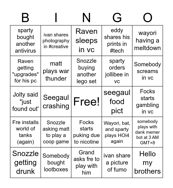 This bingo card has a free space and 29 words: Snozzle getting drunk, somebody new joins the server, Seegaul crashing, Bat starts creating lewd arts in AI, sparty bought another antivirus, Raven sleeps in vc, matt plays war thunder, Snozzle asking matt to play a coop game, seegaul food pict, Somebody bought lootboxes, Focks starts gambling in vc, Hello my brothers, Grand asks fre to play with him, ivan share a picture of fumo, Somebody screams in vc, Nicer starts sharing war footage in #war-tinder, Focks starts puking due to nicotine, Fre installs world of tanks (again), wayori having a meltdown, Jolty said "just found out', Wayori, bat, and sparty plays HOi4 again, wayori flexing his new fumo collection, sparty orders jollibee in vc, Raven getting "upgrades" for his pc, eddy shares his prints in #tech, ivan shares photography in #creative, somebody plays with dank memer bot at 3 AM GMT+8, Snozzle buying another lego set and Lewd AI arts being sent in #stable diffusion.