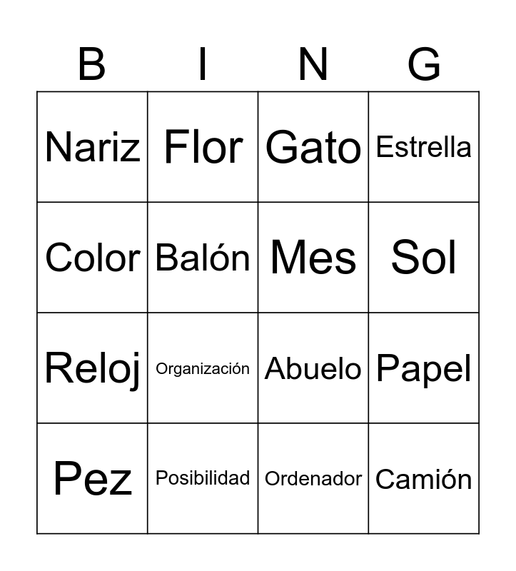 This bingo card has 29 words: Libro, Amiga, Papel, Lápiz, Nariz, Gato, Mes, Nación, Posibilidad, Casa, Ordenador, Pez, Jardín, Solución, Organización, Ciudad, Juez, Camión, Color, Abuelo, Estuche, Clase, Reloj, Balón, Estrella, Flor, Calle, Sol and Universidad.