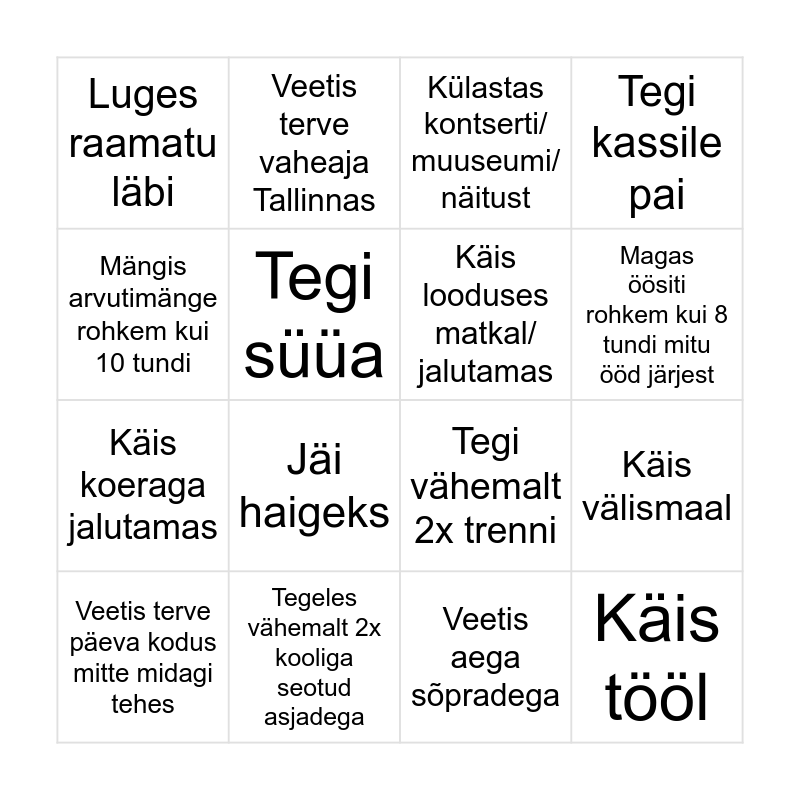 This bingo card has 16 words: Tegeles vähemalt 2x kooliga seotud asjadega, Käis välismaal, Külastas kontserti/ muuseumi/ näitust, Luges raamatu läbi, Käis koeraga jalutamas, Veetis terve vaheaja Tallinnas, Tegi vähemalt 2x trenni, Veetis aega sõpradega, Mängis arvutimänge rohkem kui 10 tundi, Tegi süüa, Veetis terve päeva kodus mitte midagi tehes, Tegi kassile pai, Jäi haigeks, Magas öösiti rohkem kui 8 tundi mitu ööd järjest, Käis looduses matkal/ jalutamas and Käis tööl.