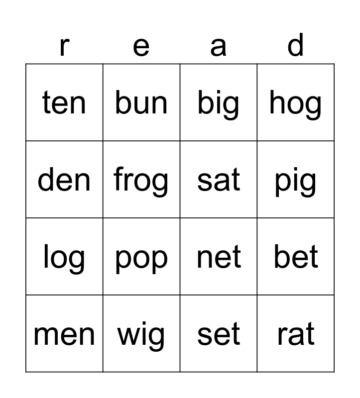 This bingo card has 61 words: Free!, cat, bat, rat, mat, hat, sat, dog, log, fog, hog, jog, frog, hen, pen, ten, men, den, when, pig, wig, big, dig, fig, jig, hop, top, mop, pop, cop, stop, run, sun, fun, bun, gun, pun, bet, pet, net, jet, wet, set, map, cap, nap, tap, gap, lap, pin, win, bin, fin, kin, sin, bug, mug, rug, hug, jug and tug.