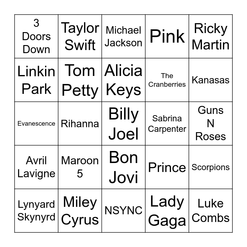 This bingo card has a free space and 49 words: Boston, Luke Combs, Katy Perry, NSYNC, Maroon 5, Black Eye Peas, Taylor Swift, The Killers, Linkin Park, AC/DC, Tom Petty, Pink, Scorpions, Prince, Justin Bieber, Adele, Alicia Keys, Sabrina Carpenter, Imagine Dragons, Ricky Martin, Rihanna, Lady Gaga, 3 Doors Down, The Cranberries, Journey, Kanasas, Lynyard Skynyrd, Aerosmith, Bon Jovi, Avril Lavigne, Billie Eilish, Daughtry, Nickelback, Jason Mraz, Miley Cyrus, Gwen Stefani, Soundgarden, Rage Against The Machine, Guns N Roses, Breaking Benjamin, Disturbed, Foo Fighters, Red Hot Chili Peppers, System Of A Down, Evanescence, Michael Jackson, Metallica, Beastie Boys and R.E.M.