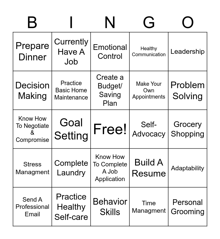 This bingo card has a free space and 24 words: Complete Laundry, Practice Healthy Self-care, Create a Budget/ Saving Plan, Send A Professional Email, Leadership, Prepare Dinner, Decision Making, Currently Have A Job, Self-Advocacy, Know How To Complete A Job Application, Make Your Own Appointments, Know How To Negotiate & Compromise, Build A Resume, Adaptability, Practice Basic Home Maintenance, Time Managment, Grocery Shopping, Emotional Control, Problem Solving, Goal Setting, Personal Grooming, Stress Managment, Healthy Communication and Behavior Skills.