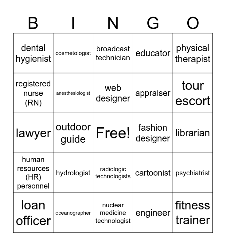 This bingo card has a free space and 24 words: hydrologist, oceanographer, web designer, loan officer, physical therapist, dental hygienist, registered nurse (RN), cosmetologist, fashion designer, radiologic technologists, appraiser, lawyer, cartoonist, psychiatrist, anesthesiologist, engineer, librarian, broadcast technician, tour escort, outdoor guide, fitness trainer, human resources (HR) personnel, educator and nuclear medicine technologist.