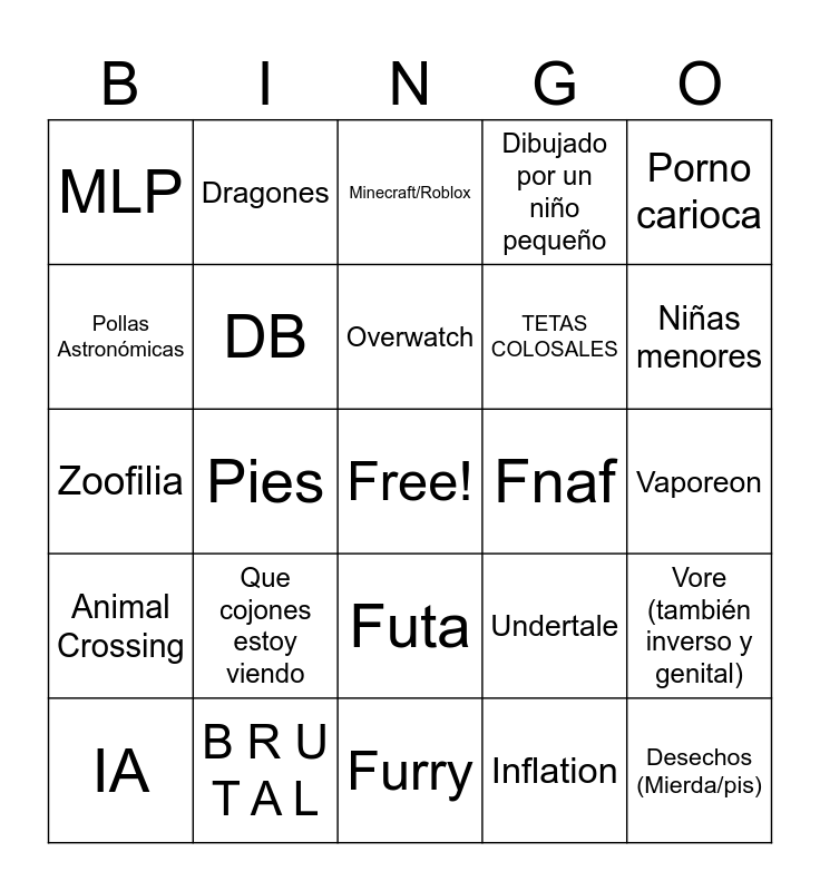 This bingo card has a free space and 36 words: PECSJOB, Pixelart, 3D pocho, DB, Undertale, Animal Crossing, Overwatch, Cuadros no porno, Porno carioca, Sonic, Pies, Dibujado por un niño pequeño, Flatulencias, Fnaf, Niñas menores, MLP, Femboy, Que cojones estoy viendo, Desechos (Mierda/pis), Minecraft/Roblox, Vaporeon, Vore (también inverso y genital), B R U T A L, IA, Furry, Dragones, Zoofilia, Meme, TETAS COLOSALES, Pollas Astronómicas, Caballos, Gigachad, Inflation, Futa, Embarazadas and Felicidad abundante.