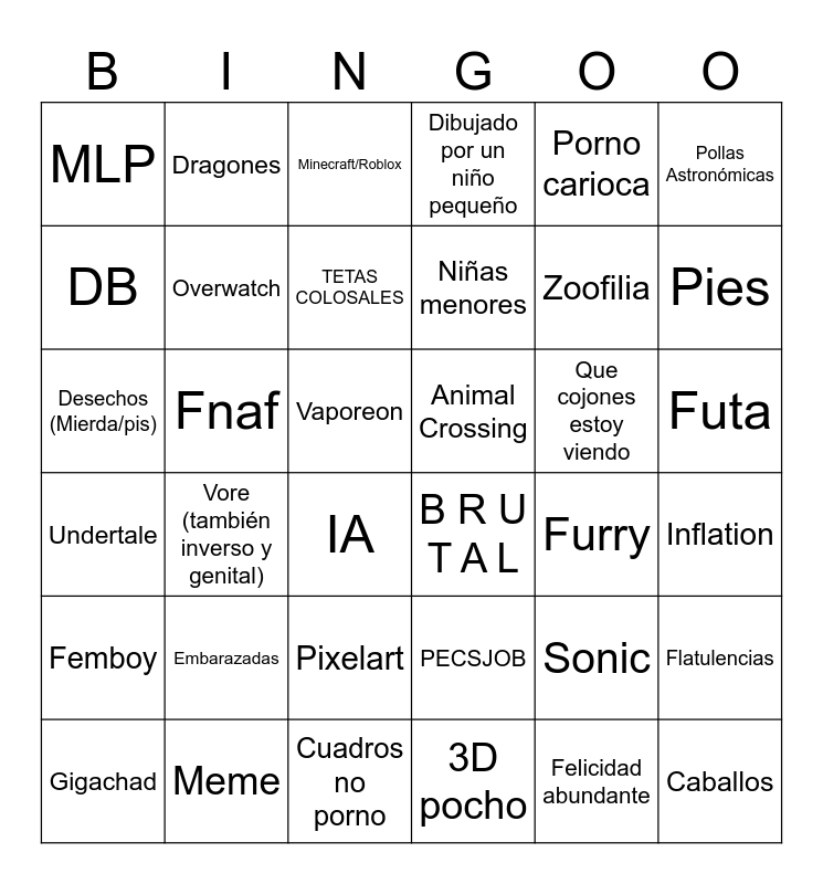 This bingo card has 36 words: PECSJOB, Pixelart, 3D pocho, DB, Undertale, Animal Crossing, Overwatch, Cuadros no porno, Porno carioca, Sonic, Pies, Dibujado por un niño pequeño, Flatulencias, Fnaf, Niñas menores, MLP, Femboy, Que cojones estoy viendo, Desechos (Mierda/pis), Minecraft/Roblox, Vaporeon, Vore (también inverso y genital), B R U T A L, IA, Furry, Dragones, Zoofilia, Meme, TETAS COLOSALES, Pollas Astronómicas, Caballos, Gigachad, Inflation, Futa, Embarazadas and Felicidad abundante.