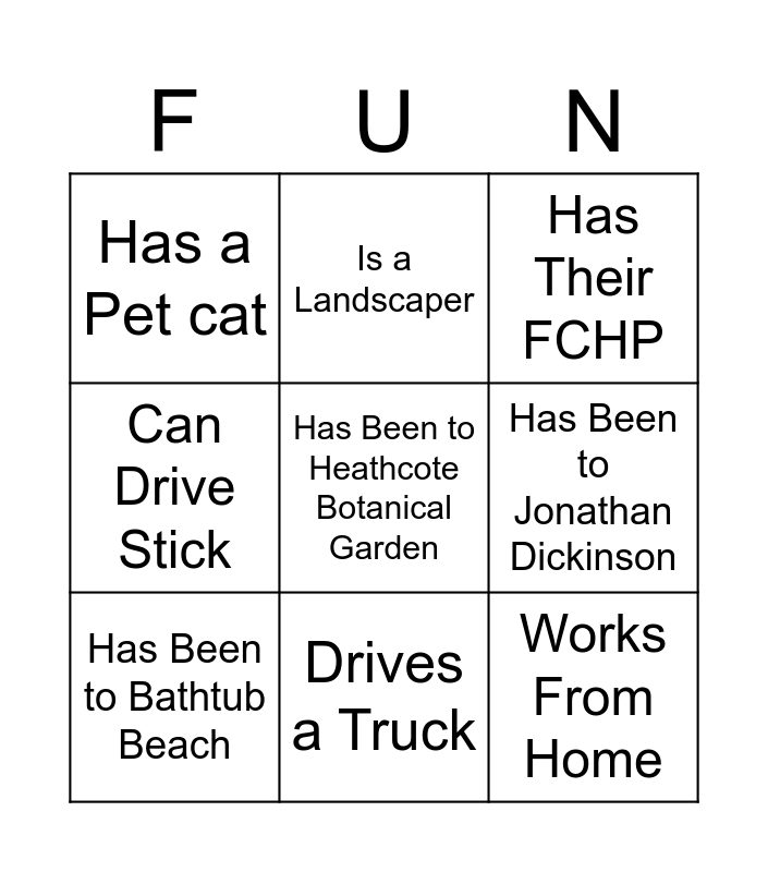 This bingo card has a free space and 8 words: Has Been to Jonathan Dickinson, Has Their FCHP, Is a Landscaper, Has Been to Bathtub Beach, Has a Pet cat, Works From Home, Can Drive Stick and Drives a Truck.