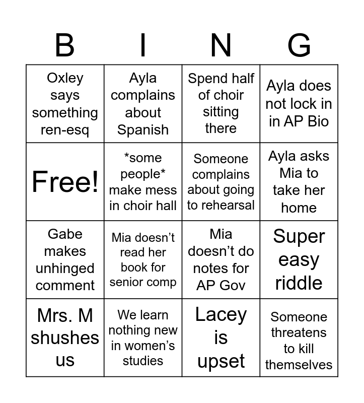 This bingo card has 16 words: We learn nothing new in women’s studies, Super easy riddle, Spend half of choir sitting there, Oxley says something ren-esq, Gabe makes unhinged comment, Ayla complains about Spanish, Mia doesn’t do notes for AP Gov, Lacey is upset, Free!, *some people* make mess in choir hall, Mrs. M shushes us, Ayla does not lock in in AP Bio, Mia doesn’t read her book for senior comp, Ayla asks Mia to take her home, Someone complains about going to rehearsal and Someone threatens to kill themselves.