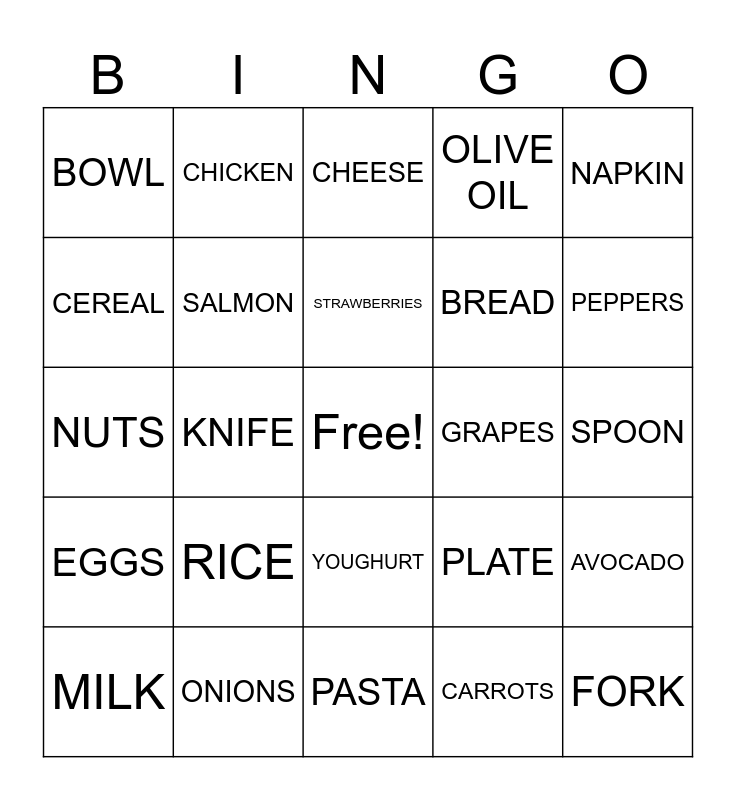 This bingo card has a free space and 28 words: AVOCADO, BEANS, BREAD, CARROTS, CEREAL, CHEESE, CHICKEN, EGGS, GRAPES, MILK, NUTS, OLIVE OIL, ONIONS, PASTA, PEPPERS, PINEAPLE, RICE, SALMON, STRAWBERRIES, YOUGHURT, BOWL, CUP, FORK, KNIFE, SPOON, PLATE, NAPKIN and GLASS.