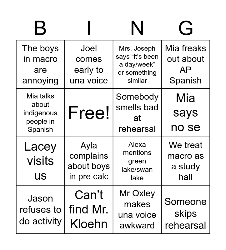 This bingo card has 16 words: Can’t find Mr. Kloehn, We treat macro as a study hall, Mrs. Joseph says “it’s been a day/week” or something similar, The boys in macro are annoying, Lacey visits us, Joel comes early to una voice, Alexa mentions green lake/swan lake, Mr Oxley makes una voice awkward, Mia talks about indigenous people in Spanish, Free!, Jason refuses to do activity, Mia freaks out about AP Spanish, Ayla complains about boys in pre calc, Mia says no se, Somebody smells bad at rehearsal and Someone skips rehearsal.