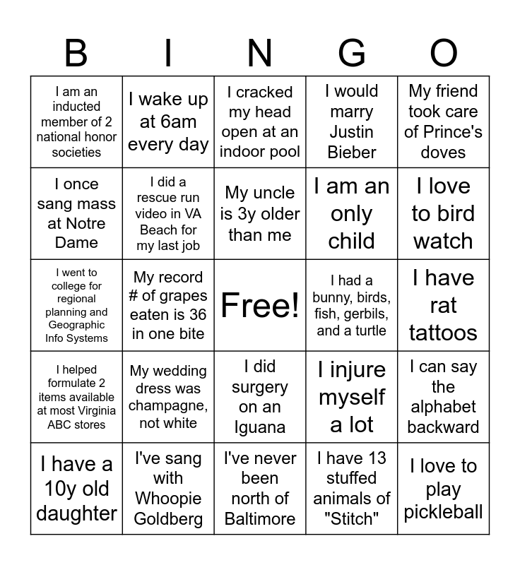 This bingo card has a free space and 24 words: My wedding dress was champagne, not white, I've sang with Whoopie Goldberg, My uncle is 3y older than me, I have a 10y old daughter, My friend took care of Prince's doves, I am an inducted member of 2 national honor societies, I once sang mass at Notre Dame, I wake up at 6am every day, I had a bunny, birds, fish, gerbils, and a turtle, I did surgery on an Iguana, I am an only child, I went to college for regional planning and Geographic Info Systems, I injure myself a lot, I can say the alphabet backward, I did a rescue run video in VA Beach for my last job, I have 13 stuffed animals of "Stitch", I have rat tattoos, I cracked my head open at an indoor pool, I love to bird watch, My record # of grapes eaten is 36 in one bite, I love to play pickleball, I helped formulate 2 items available at most Virginia ABC stores, I would marry Justin Bieber and I've never been north of Baltimore.