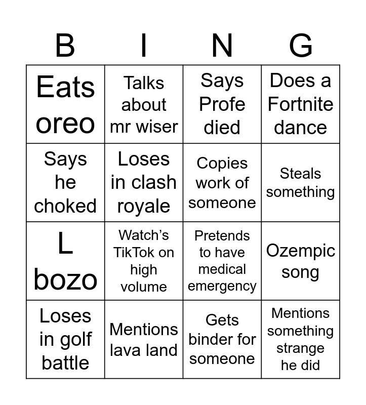 This bingo card has 16 words: Mentions lava land, Ozempic song, Says Profe died, Eats oreo, L bozo, Talks about mr wiser, Pretends to have medical emergency, Gets binder for someone, Says he choked, Loses in clash royale, Loses in golf battle, Does a Fortnite dance, Watch’s TikTok on high volume, Steals something, Copies work of someone and Mentions something strange he did.