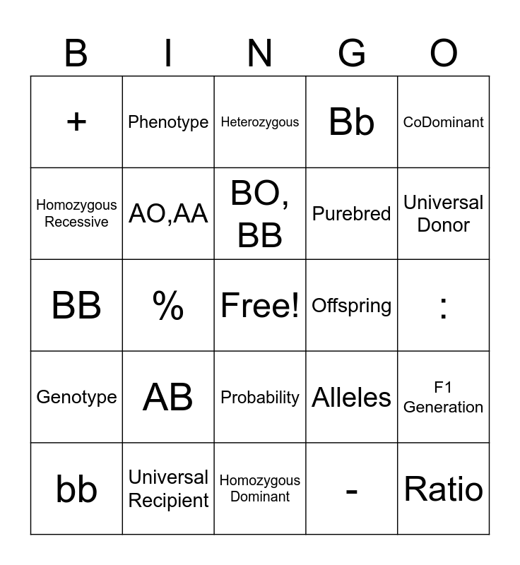 This bingo card has a free space and 27 words: Alleles, Hybrid, Purebred, Homozygous Dominant, Homozygous Recessive, Heterozygous, Phenotype, Genotype, Offspring, F1 Generation, BB, Bb, bb, Universal Recipient, Universal Donor, OO, AO,AA, BO, BB, AB, +, :, -, %, Ratio, Probability, CoDominant and Monohybrid.