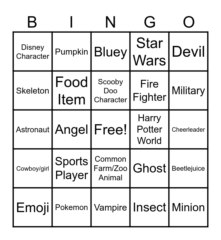 This bingo card has a free space and 48 words: Witch, Minion, Roblox/Minecraft/Fortnite, Vampire, Sports Player, Regal Costume, Pumpkin, Clown, Skeleton, Scream, Food Item, Star Wars, Beetlejuice, Ghost, Police Officer, Superhero, Scooby Doo Character, Harry Potter World, Joker/Harley Quinn, Devil, Angel, Insect, Disney Character, Fire Fighter, Dinosaur, Military, Emoji, Mario Universe, Common Farm/Zoo Animal, Cowboy/girl, Cat, Dog, Alien, Ghostbusters, Pokemon, Ballerina, Magician, Cheerleader, Pirate, Fairytale/Mythical, Ninja/Martial Arts, Mermaid, Bluey, Waldo, Astronaut, Medical Profession, Movie Monster and Pilot.