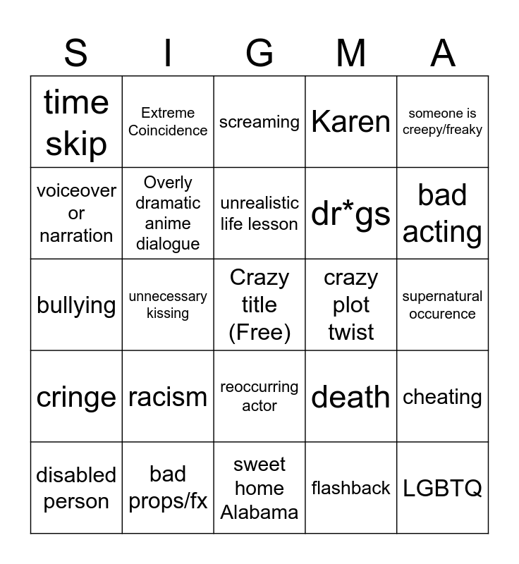 This bingo card has a free space and 29 words: disabled person, hub plotline, unnecessary kissing, violence, time skip, screaming, Overly dramatic anime dialogue, racism, crazy plot twist, bad props/fx, supernatural occurence, LGBTQ, sweet home Alabama, flashback, bad acting, pulls out a gun, reoccurring actor, cringe, someone is creepy/freaky, bullying, death, stereotypical names, dr*gs, voiceover or narration, Karen, Extreme Coincidence, cheating, unrealistic life lesson and taboo.