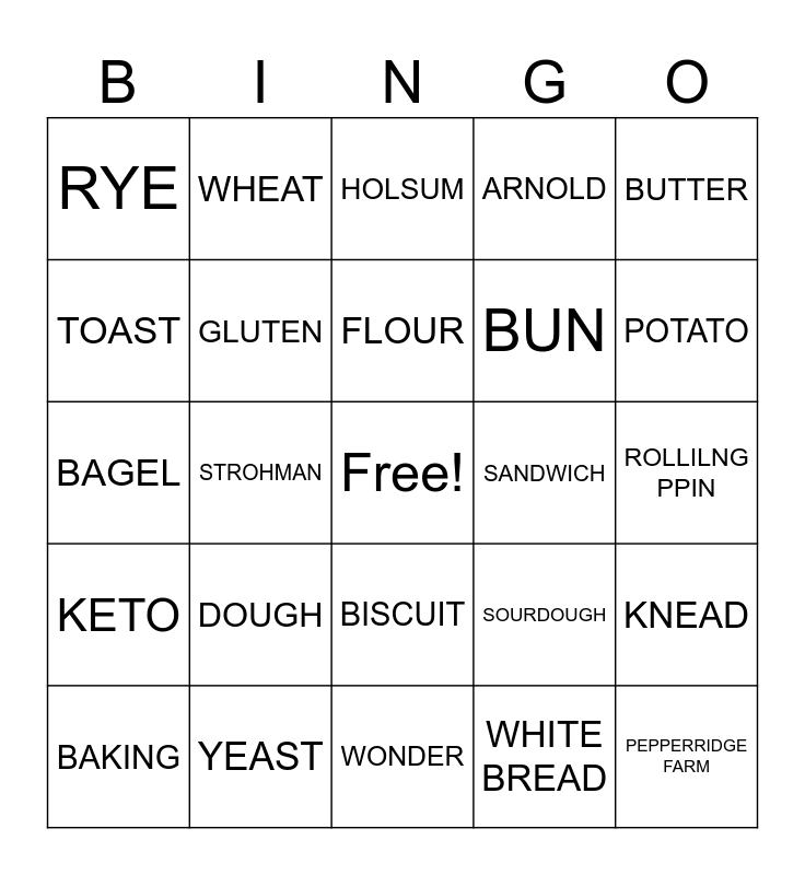 This bingo card has a free space and 24 words: DOUGH, YEAST, FLOUR, BAKING, BUTTER, RYE, TOAST, WHEAT, SANDWICH, BISCUIT, BUN, BAGEL, SOURDOUGH, KNEAD, GLUTEN, WHITE BREAD, ROLLILNG PPIN, HOLSUM, POTATO, STROHMAN, PEPPERRIDGE FARM, KETO, ARNOLD and WONDER.
