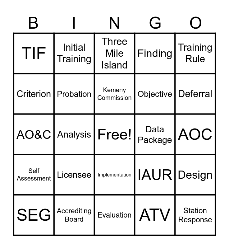 This bingo card has a free space and 34 words: Vertical Slice, ATV, SAT, Renewal, Self Assessment, Probation, Training Rule, SEG, Initial Training, Continuing Training, Kemeny Commission, Three Mile Island, NRC, INPO, Data Package, Deferral, Accrediting Board, AO&C, Licensee, IAUR, Implementation, SIF, TIF, AOC, Evaluation, Station Response, Finding, Memorandum of Agreement, Objective, Criterion, Basis, Analysis, Design and Development.