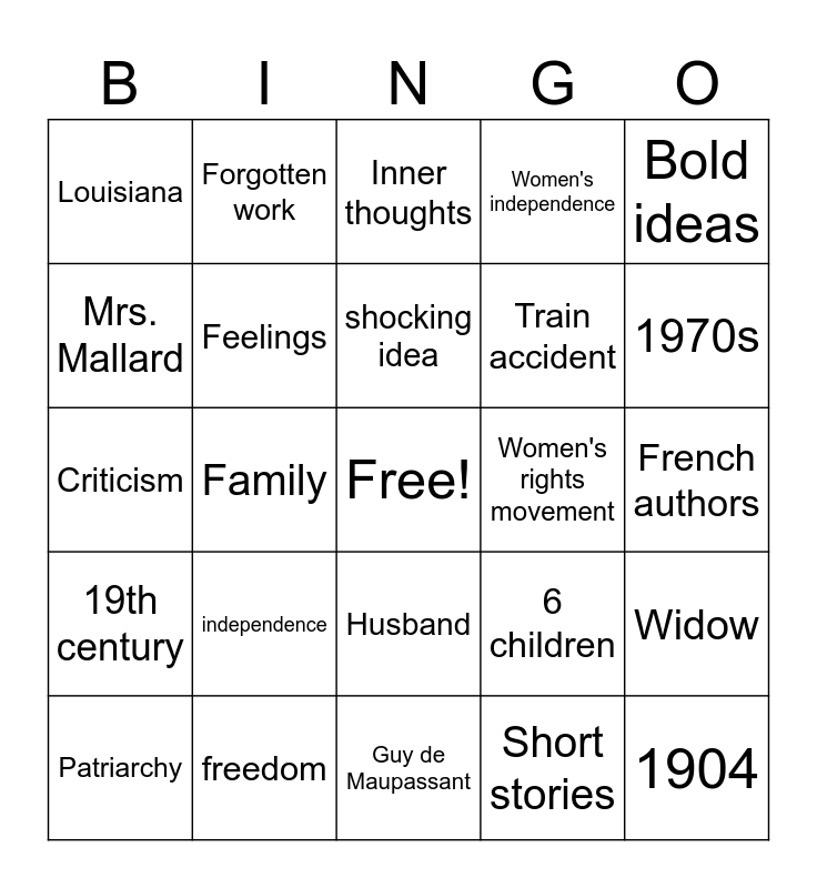 This bingo card has a free space and 24 words: independence, freedom, shocking idea, Patriarchy, Bold ideas, Louisiana, Mrs. Mallard, Forgotten work, Women's rights movement, Husband, Train accident, Criticism, 6 children, Widow, Feelings, Short stories, French authors, Inner thoughts, 1970s, Family, 1904, 19th century, Women's independence and Guy de Maupassant.