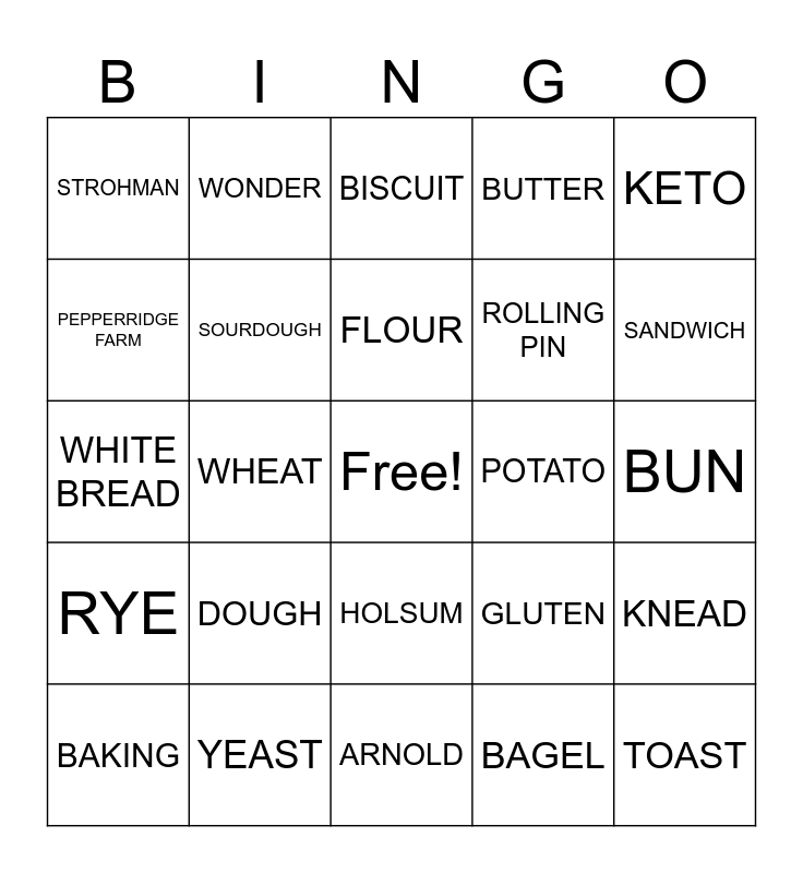 This bingo card has a free space and 24 words: DOUGH, YEAST, FLOUR, BAKING, KETO, STROHMAN, PEPPERRIDGE FARM, WONDER, POTATO, HOLSUM, ROLLING PIN, WHITE BREAD, GLUTEN, KNEAD, SOURDOUGH, BAGEL, BUN, BISCUIT, SANDWICH, WHEAT, TOAST, RYE, BUTTER and ARNOLD.