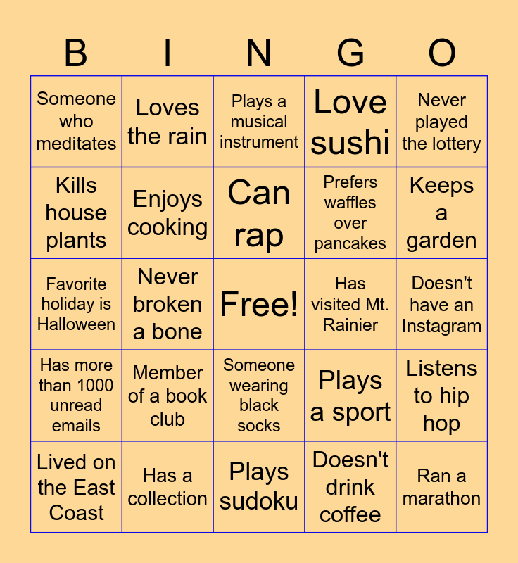 This bingo card has a free space and 29 words: Lived on the East Coast, Has a pet that isn't a dog or cat, Never broken a bone, Can Juggle, Someone who meditates, Plays a musical instrument, Enjoys cooking, Member of a book club, Has visited Mt. Rainier, Has a collection, Doesn't have an Instagram, Ran a marathon, Plays sudoku, Doesn't drink coffee, Keeps a garden, Speaks multiple languages, Someone wearing black socks, Has more than 1000 unread emails, Never played the lottery, Favorite holiday is Halloween, Plays a sport, Saw a movie in the theater last month, Prefers waffles over pancakes, Kills house plants, Love sushi, Loves the rain, Listens to hip hop, Can rap and Has more than 4 pairs of shoes.