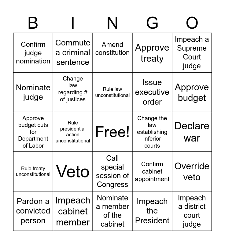 This bingo card has a free space and 24 words: Veto, Impeach cabinet member, Rule law unconstitutional, Pardon a convicted person, Impeach a Supreme Court judge, Confirm judge nomination, Nominate judge, Commute a criminal sentence, Change the law establishing inferior courts, Call special session of Congress, Issue executive order, Approve budget cuts for Department of Labor, Confirm cabinet appointment, Override veto, Change law regarding # of justices, Impeach the President, Declare war, Amend constitution, Approve budget, Rule presidential action unconstitutional, Impeach a district court judge, Rule treaty unconstitutional, Approve treaty and Nominate a member of the cabinet.