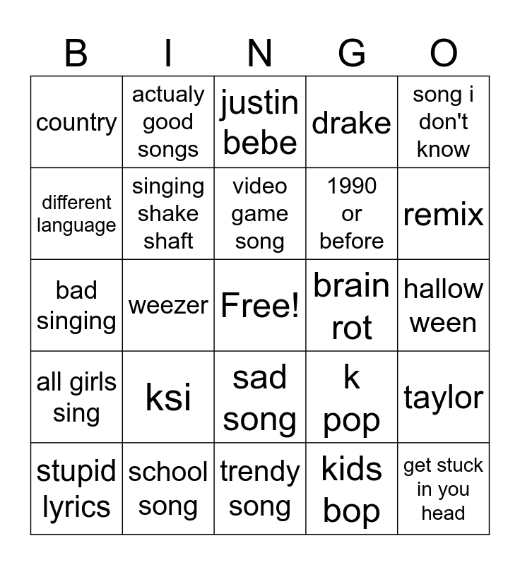 This bingo card has a free space and 24 words: ksi, school song, video game song, stupid lyrics, song i don't know, country, different language, actualy good songs, brain rot, sad song, 1990 or before, bad singing, k pop, taylor, singing shake shaft, kids bop, hallow ween, justin bebe, remix, weezer, get stuck in you head, all girls sing, drake and trendy song.