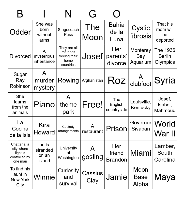 This bingo card has a free space and 48 words: Her friend Brandon, Monterey Bay Aquarium, Cassius Clay, Piano, Rowing, Josef, Isabel, Mahmoud, She was born without arms, Winnie, Cystic fibrosis, A restaurant, That his mom will be deported, The Moon, A clubfoot, Roz, Chattana, a city where light is controlled by one man, Louisville, Kentucky, Divorced, The 1936 Berlin Olympics, Miami, Bahía de la Luna, Her parents’ divorce, A theme park, Odder, A mysterious inheritance, Lamber, South Carolina, They are all refugees fleeing their home countries, Syria, To find his aunt in New York City, Afghanistan, A murder mystery, Moon Base Alpha, The English countryside, World War II, he is stranded on an island, She learns from the animals, Prison, Governor Sivapan, Sugar Ray Robinson, Custody arrangements, University of Washington, La Cocina de la Isla, Maya, Stagecoach Pass, Curiosity and survival, Josef, A gosling, Kira Howard and Jamie.