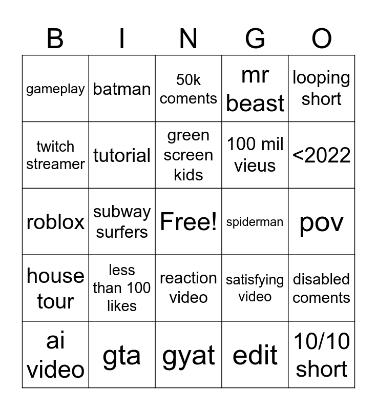 This bingo card has a free space and 24 words: less than 100 likes, gta, green screen kids, ai video, looping short, gameplay, twitch streamer, batman, spiderman, reaction video, 100 mil vieus, roblox, satisfying video, disabled coments, tutorial, edit, pov, 50k coments, <2022, subway surfers, 10/10 short, house tour, mr beast and gyat.