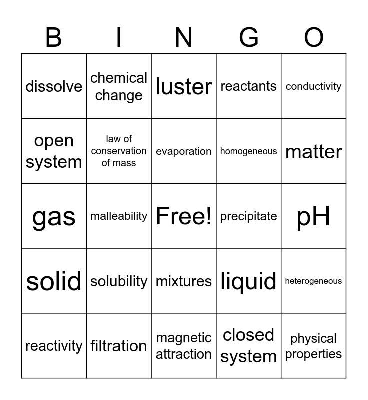 This bingo card has a free space and 24 words: solubility, filtration, evaporation, reactivity, conductivity, dissolve, open system, chemical change, precipitate, mixtures, homogeneous, gas, liquid, heterogeneous, law of conservation of mass, closed system, pH, luster, matter, malleability, physical properties, solid, reactants and magnetic attraction.