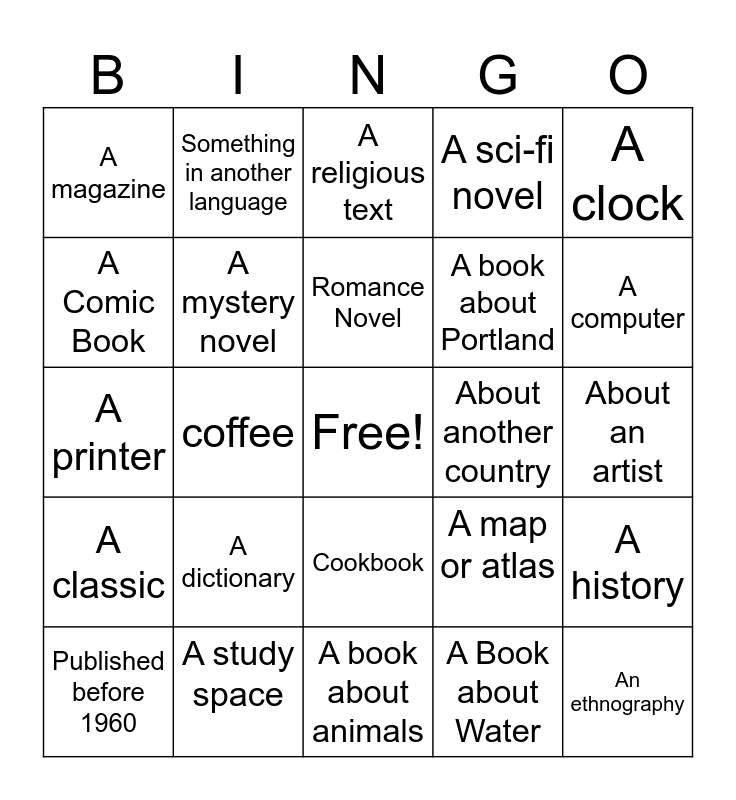 This bingo card has a free space and 24 words: A dictionary, A study space, Romance Novel, Published before 1960, A clock, A magazine, A Comic Book, Something in another language, About another country, Cookbook, A book about Portland, A printer, A map or atlas, A history, A mystery novel, A Book about Water, About an artist, A religious text, A computer, coffee, An ethnography, A classic, A sci-fi novel and A book about animals.