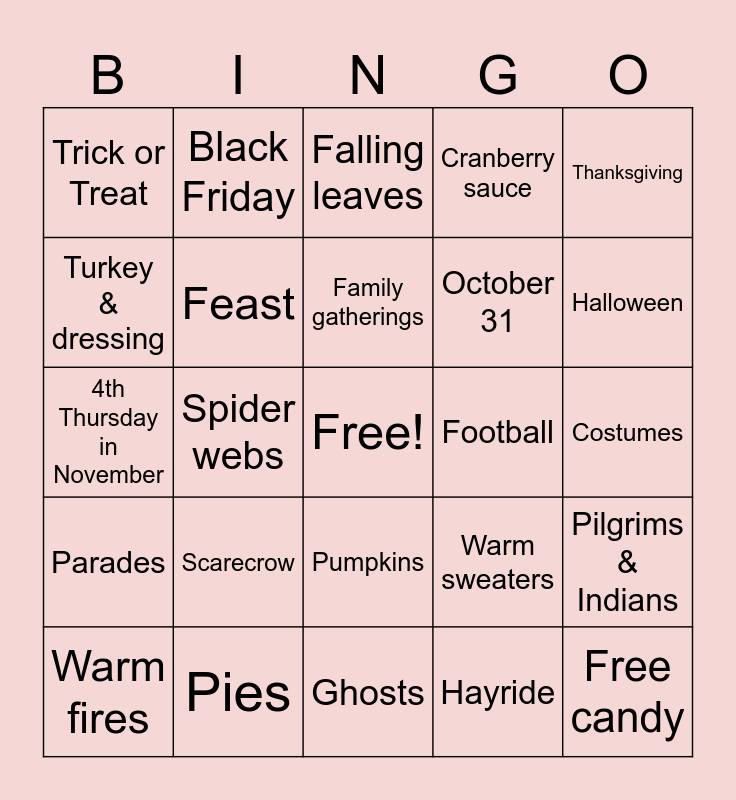 This bingo card has a free space and 24 words: Scarecrow, Pies, Family gatherings, Warm fires, Thanksgiving, Trick or Treat, Turkey & dressing, Black Friday, Football, Pumpkins, October 31, 4th Thursday in November, Warm sweaters, Pilgrims & Indians, Feast, Hayride, Costumes, Falling leaves, Halloween, Spider webs, Free candy, Parades, Cranberry sauce and Ghosts.