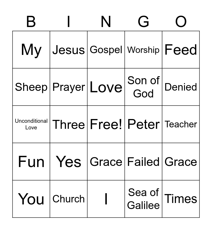 This bingo card has a free space and 25 words: Yes, I, Love, You, Feed, My, Sheep, Jesus, Peter, Grace, Son of God, Unconditional Love, Failed, Grace, Prayer, Fisher of Men, Teacher, Gospel, Denied, Three, Times, Church, Fun, Worship and Sea of Galilee.