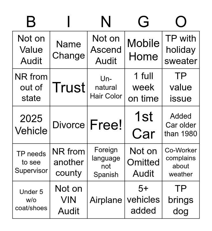 This bingo card has a free space and 24 words: NR from another county, Not on VIN Audit, Un-natural Hair Color, Under 5 w/o coat/shoes, TP with holiday sweater, Not on Value Audit, NR from out of state, Name Change, 1st Car, Foreign language not Spanish, 1 full week on time, 2025 Vehicle, Not on Omitted Audit, Co-Worker complains about weather, Trust, 5+ vehicles added, Added Car older than 1980, Not on Ascend Audit, TP value issue, Divorce, TP brings dog, TP needs to see Supervisor, Mobile Home and Airplane.