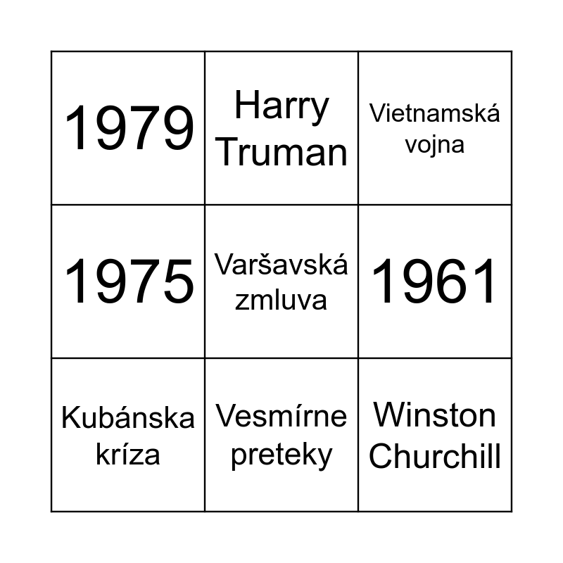 This bingo card has a free space and 8 words: 1961, Vietnamská vojna, Harry Truman, Kubánska kríza, 1979, Winston Churchill, 1975 and Vesmírne preteky.