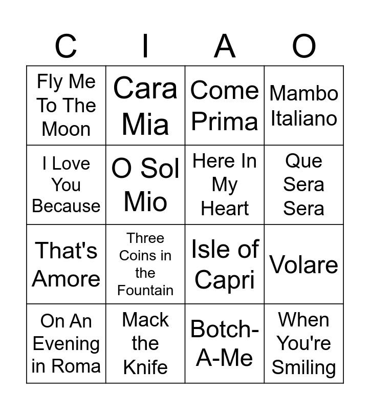 This bingo card has 20 words: Volare, Lazy Mary, Come Prima, Papa Loves Mambo, On An Evening in Roma, I Love You Because, Mack the Knife, Fly Me To The Moon, That's Amore, Cara Mia, Three Coins in the Fountain, Isle of Capri, O Sol Mio, When You're Smiling, Here In My Heart, Arrivederci Roma, Que Sera Sera, Mambo Italiano, Botch- A-Me and Funiculi-Funicula.