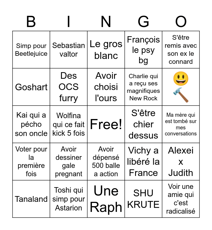 This bingo card has a free space and 24 words: Avoir dessiner gale pregnant, Toshi qui simp pour Astarion, Avoir choisi l'ours, Tanaland, S'être remis avec son ex le connard, Simp pour Beetlejuice, Goshart, Sebastian valtor, S'être chier dessus, Avoir dépensé 500 balle a action, Charlie qui a reçu ses magnifiques New Rock, Kai qui a pécho son oncle, Vichy a libéré la France, Alexei x Judith, Des OCS furry, SHU KRUTE, Ma mère qui est tombé sur mes conversations, Le gros blanc, 😃🔨, Wolfina qui ce fait kick 5 fois, Voir une amie qui c'est radicalisé, Voter pour la première fois, François le psy bg and Une Raph.