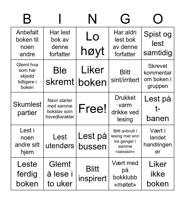 This bingo card has a free space and 29 words: Leste ferdig boken, Lest i sengen, Navn starter med samme bokstav som hovedkarakter, Felte en tåre, Anbefalt boken til noen andre, Lo høyt, Ble skremt, Lest utendørs, Drukket varm drikke ved lesing, Glemt å lese i to uker, Lest på t-banen, Liker ikke boken, Blitt inspirert, Vært med på bokklubb «møtet», Skrevet kommentar om boken i gruppen, Lest tre kapitler sammenhengende, Lest på bussen, Lest i noen andre sitt hjem, Spist og lest samtidig, Skumlest partier, Blitt avbrutt i lesing mer enn tre ganger i samme «session», Leser på originalspråket, Blitt sint/irritert, Glemt hva som har skjedd tidligere i boken, Har aldri lest bok av denne forfatter, Har lest bok av denne forfatter, Vært i landet handlingen er, Liker boken and Måttet Google definisjonen av et ord.