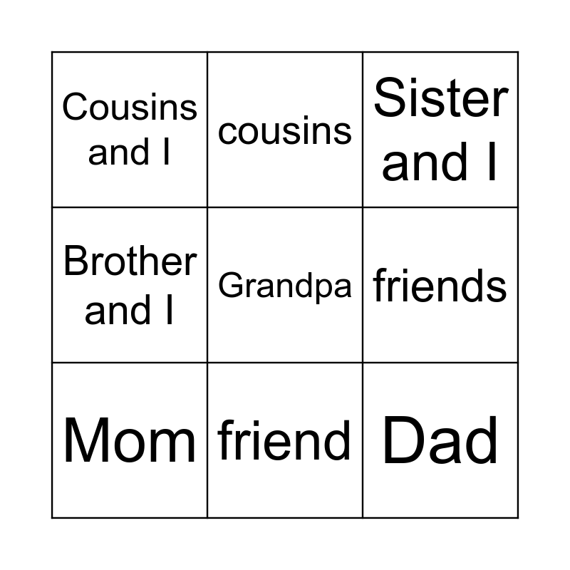 This bingo card has a free space and 11 words: brother, friend, Dad, Mom, cousins, Sister and I, friends, Grandma, Brother and I, Cousins and I and Friends and I.