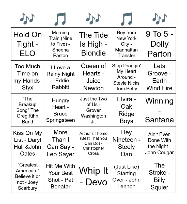 This bingo card has a free space and 34 words: Bette Davis Eyes - Kim Carnes, (Just Like) Starting Over - John Lennon, Jessie's Girl - Rick Springfield, Celebration - Kool and The Gang, Kiss On My List - Daryl Hall &John Oates, I Love a Rainy Night - Eddie Rabbitt, 9 To 5 - Dolly Parton, "Greatest American " Believe it or not - Joey Scarbury, Morning Train (Nine to Five) - Sheena Easton, Being With You - Smokey Robinson, Queen of Hearts - Juice Newton, The Tide Is High - Blondie, Slow Hand - Pointer Sisters, Start Me Up - Rolling Stones, Elvira - Oak Ridge Boys, Lets Groove -Earth Wind Fire, Hit Me With Your Best Shot - Pat Benatar, "The Breakup Song" The Greg Kihn Band, More Than I Can Say - Leo Sayer, Hey Nineteen - Steely Dan, Arthur's Theme (Best That You Can Do) - Christopher Cross, All Those Years Ago - George Harrison, Hold On Tight - ELO, Winning - Santana, Whip It - Devo, The Stroke - Billy Squier, Boy from New York City - Manhattan Transfer, Another One Bites the Dust - Queen, Stop Draggin' My Heart Around - Stevie Nicks Tom Petty, Too Much Time on my Hands- Styx, Our Lips are Sealed - Go-Go's, Hungry Heart - Bruce Springsteen, Ain't Even Done With the Night - John Cougar and I'm Coming Out - Diana Ross.