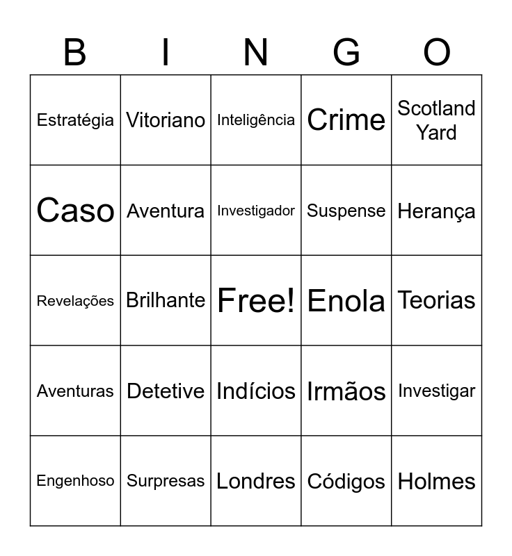 This bingo card has a free space and 50 words: Sherlock, Holmes, Watson, Londres, Detetive, Mistério, Vitoriano, Pista, Caso, Disfarce, Aventura, Crime, Investigar, Irmãos, Mycroft, Enigmática, Investigador, Enola, Mãe, Scotland Yard, Brilhante, Códigos, Estratégia, Suspense, Curiosidade, Narrativa, Herança, Rebeldia, Inteligência, Indícios, Bibliotecas, Manuscritos, Astúcia, Desafios, Surpresas, Raciocínio, Carisma, Descoberta, Arquivos, Teorias, Evidências, Oculto, Intriga, Agilidade, Engenhoso, Revelações, Perspicácia, Herói, Aventuras and Investigação.