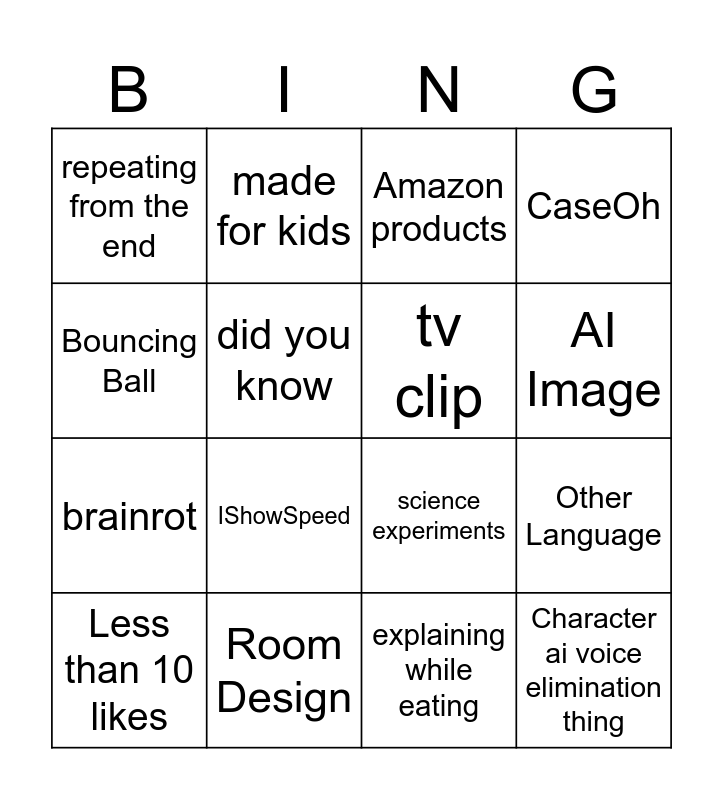 This bingo card has 16 words: Room Design, Other Language, Amazon products, repeating from the end, brainrot, made for kids, science experiments, explaining while eating, Bouncing Ball, did you know, Less than 10 likes, CaseOh, IShowSpeed, AI Image, tv clip and Character ai voice elimination thing.