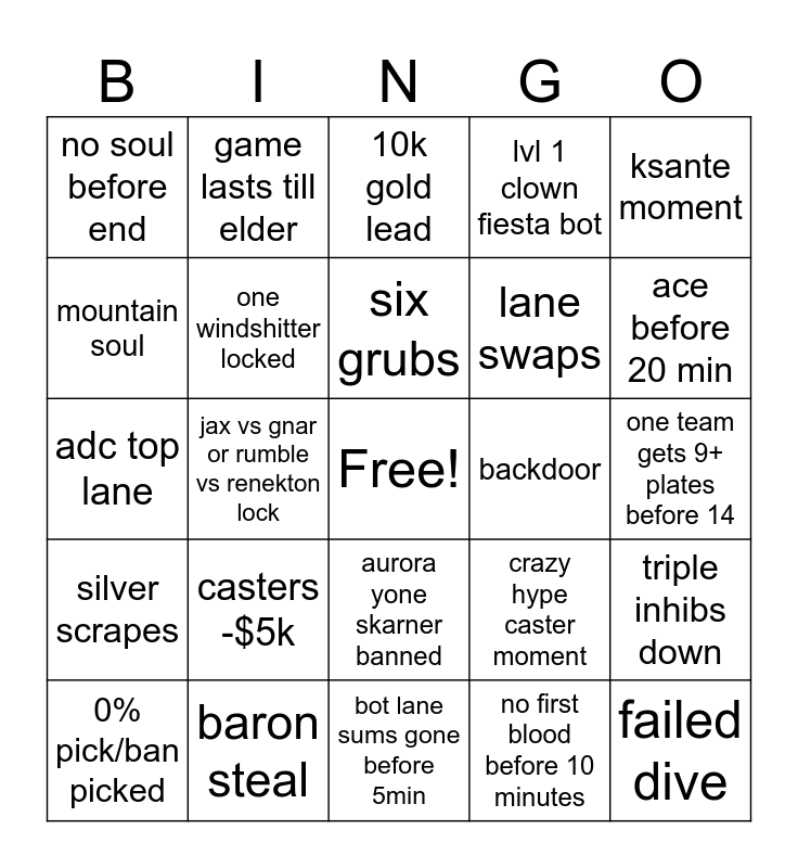 This bingo card has a free space and 24 words: casters -$5k, baron steal, six grubs, 0% pick/ban picked, ksante moment, no soul before end, mountain soul, game lasts till elder, backdoor, aurora yone skarner banned, lane swaps, adc top lane, crazy hype caster moment, triple inhibs down, one windshitter locked, no first blood before 10 minutes, one team gets 9+ plates before 14, 10k gold lead, ace before 20 min, jax vs gnar or rumble vs renekton lock, failed dive, silver scrapes, lvl 1 clown fiesta bot and bot lane sums gone before 5min.