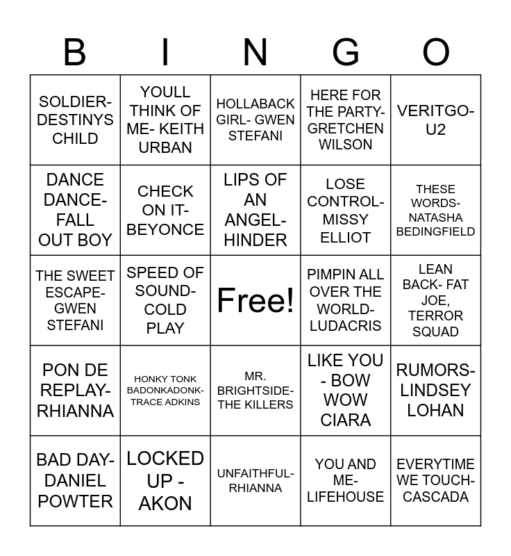 This bingo card has a free space and 70 words: LETS GET IT STARTED- BLACK EYE PEAS, LEAN BACK- FAT JOE, TERROR SQUAD, GOODIES- CIARA/PETEY PABLO, CH-CHECK IT OUT- BEASTIE BOYS, LOCKED UP - AKON, PIECES OF ME- ASHLEE SIMPSON, HERE FOR THE PARTY- GRETCHEN WILSON, DAYS GO BY- KEITH URBAN, VERITGO- U2, WHAT ARE YOU WAITING FOR? GWEN STEFANI, RUMORS- LINDSEY LOHAN, DROP IT LIKE ITS HOT- SNOOP DOGG, SOLDIER- DESTINYS CHILD, HOLLABACK GIRL- GWEN STEFANI, BABY, IM BACK- BABY BASH/ AKON, SPEED OF SOUND- COLD PLAY, MR. BRIGHTSIDE- THE KILLERS, LOSE CONTROL- MISSY ELLIOT, DON’T CHA- PUSSYCAT DOLLS, PON DE REPLAY- RHIANNA, PIMPIN ALL OVER THE WORLD- LUDACRIS, LIKE YOU - BOW WOW CIARA, THESE WORDS- NATASHA BEDINGFIELD, BEHIND THESE HAZEL EYES- KELLY CLARKSON, LISTEN TO YOUR HEART- DHT, JUST WANT YOU TO KNOW- BACKSTREET BOYS, JUST THE GIRL- THE CLICK FIVE, BEVERLY HILLS- WEEZER, YOU AND ME- LIFEHOUSE, FIX YOU- COLDPLAY, YOULL THINK OF ME- KEITH URBAN, SUGAR WERE GOIN DOWN- FALL OUT BOY, DON’T FORGET ABOUT US- MARIAH CAREY, STICKITWITU- THE PUSSYCAT DOLLS, MY HUMPS- BLACK EYED PEAS, LEAN WIT IT, ROCK WIT IT- DEM FRANCHIZE BOYS, BECAUSE OF YOU- KELLY CLARKSON, UNWRITTEN- NATASHA BEDINGFIELD, PHOTOGRAPH- NICKELBACK, DANCE DANCE- FALL OUT BOY, DIRTY LITTLE SECRET- ALL AMERICAN REJECTS, HONKY TONK BADONKADONK- TRACE ADKINS, EVERYTIME WE TOUCH- CASCADA, SOS- RHIANNA, TEMPERATURE- SEAN PAUL, CHECK ON IT- BEYONCE, BAD DAY- DANIEL POWTER, OVER MY HEAD- THE FRAY, BLACK HORSE AND THE CHERRY TREE- KT TUNSTALL, MOVE ALONG-ALL AMERICAN REJECTS, LONDON BRIDGE- FERGIE, PROMISCUOUS- NELLY FURTADO, BUTTONS- PUSSYCAT DOLLS, SEXYBACK- JUSTIN TIMBERLAKE, UNFAITHFUL- RHIANNA, TOO LITTLE TOO LATE- JOJO, LIPS OF AN ANGEL- HINDER, FAR AWAY- NICKELBACK, SUMMERTIME- KENNY CHESNEY, GIRLFRIEND- AVRIL LAVIGNE, THE SWEET ESCAPE- GWEN STEFANI, BUY YOU A DRANK- TPAIN, BEFORE HE CHEATS- CARRIE UNDERWOOD, HOME- DAUGHTRY, SUMMER LOVE- JUSTIN TIMBERLAKE, THE WAY I ARE- TIMBALAND, BEAUTIFUL GIRLS- SEAN KINGSTON, CYCLONE- BABY BASH/ TPAIN, ROCKSTAR- NICKELBACK and FIRST TIME- LIFEHOUSE.