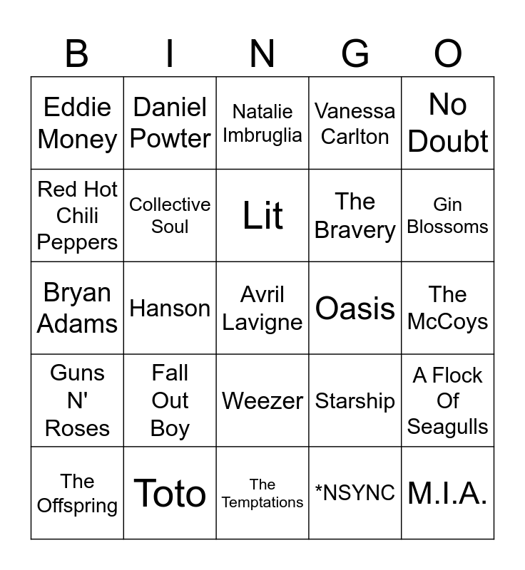 This bingo card has 90 words: Free!, blink-182, Weezer, Sum 41, Fall Out Boy, Fall Out Boy, Billy Joel, Bowling For Soup, Yellowcard, Vampire Weekend, The Killers, Linkin Park, Van Morrison, The McCoys, Green Day, Lit, Semisonic, Foo Fighters, The Cardigans, Whitney Houston, Run-D.M.C., Smash Mouth, The Temptations, Elton John (Children's), Bryan Adams, Toto, Michael Jackson, Whitney Houston, Wham!, Bon Jovi, Survivor, A Flock Of Seagulls, Devo, Guns N' Roses, Eddie Money, Vanessa Carlton, Natalie Imbruglia, Nickelback, Hanson, Gin Blossoms, The Offspring, Red Hot Chili Peppers, Sister Hazel, Counting Crows, Alanis Morissette, Starship, Jimmy Eat World, The White Stripes, TLC, Green Day, The Wallflowers, The Bravery, Weezer, blink-182, Train, Rancid, Oasis, Wilson Phillips, Shania Twain, Taylor Swift, Taylor Swift, Boyz II Men, Joan Osborne, Jewel, Sheryl Crow, Backstreet Boys, Backstreet Boys, *NSYNC, Britney Spears, Shaboozey, Fall Out Boy, Avril Lavigne, Kelly Clarkson, Beastie Boys, Daniel Powter, Collective Soul, Death Cab For Cutie, Destiny's Child, Garbage, Hootie & The Blowfish, M.I.A., No Doubt, Shawn Colvin, Soul Asylum, Biz Markie, Fugees & Ms. Lauryn Hill, Biz Markie, Snoop Dogg, Billie Eilish and Sabrina Carpenter.