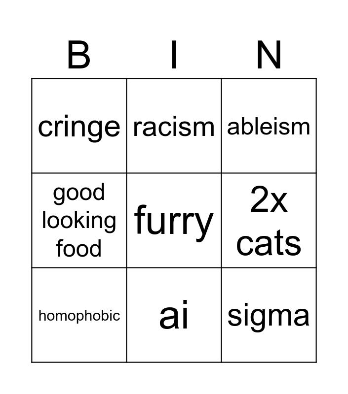 This bingo card has 9 words: homophobic, furry, ableism, cringe, racism, 2x cats, good looking food, ai and sigma.