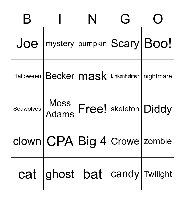 This bingo card has a free space and 29 words: cat, witch, Moss Adams, Deloitte, Joe, pumpkin, Becker, CPA, skeleton, ghost, Diddy, Twilight, bat, candy, nightmare, scream, Big 4, clown, Boo!, Seawolves, Crowe, Realize, Linkenheimer, Halloween, Scary, mystery, zombie, mask and werewolf.