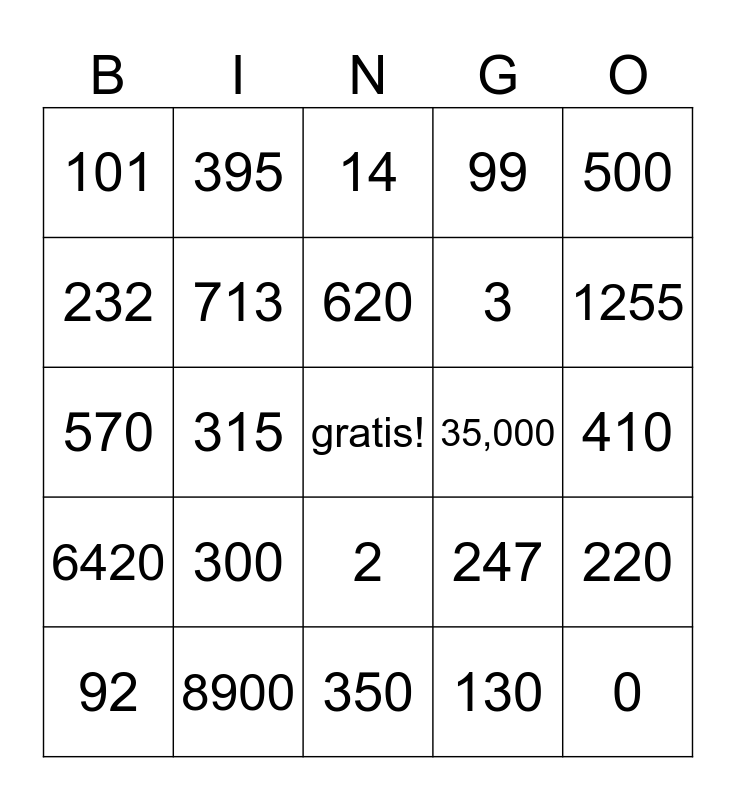 This bingo card has a free space and 79 words: 13, 30, 14, 4, 40, 100, 52, 68, 74, 88, 50, 29, 99, 101, 117, 232, 200, 300, 349, 410, 450, 500, 570, 620, 713, 816, 820, 935, 973, 1000, 1255, 1380, 350, 46, 92, 35,000, 90,000, 1500, 3000, 0, 760, 770, 70,000, 20,500, 700, 395, 1400, 11, 12, 15, 220, 315, 247, 400, 1350, 1800, 2500, 650, 716, 2, 3, 114, 10, 21, 59, 62, 72, 69, 98, 6420, 8900, 10,200, 150, 175, 105, 130, 160, 118 and 115.