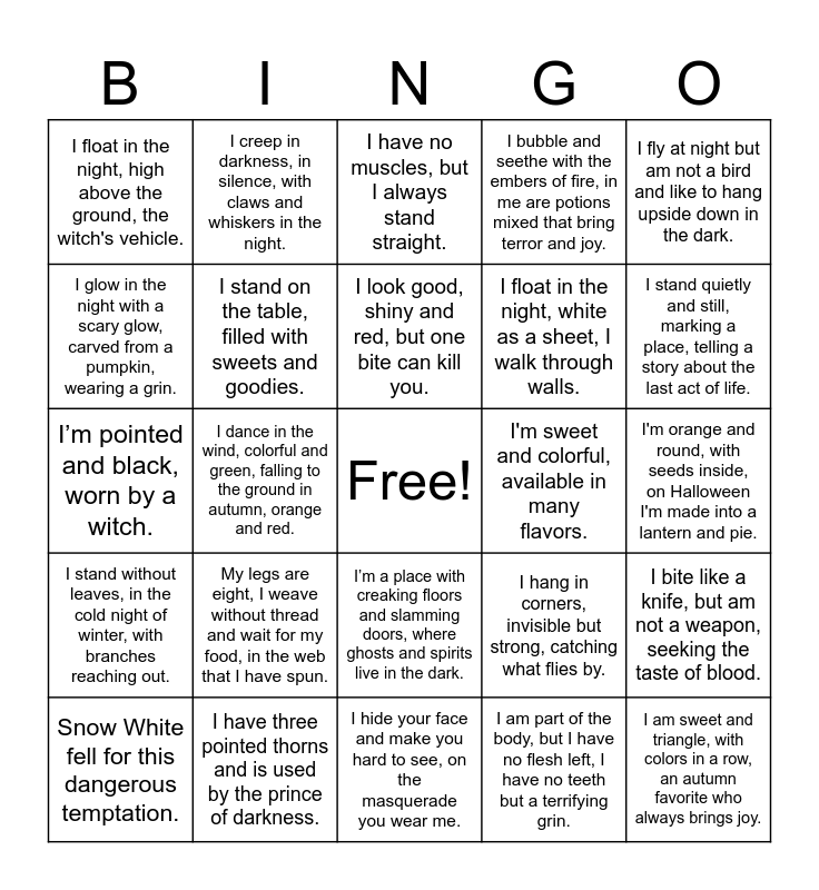 This bingo card has a free space and 25 words: My legs are eight, I weave without thread and wait for my food, in the web that I have spun., I hide your face and make you hard to see, on the masquerade you wear me., I look good, shiny and red, but one bite can kill you., Snow White fell for this dangerous temptation., I fly at night but am not a bird and like to hang upside down in the dark., I float in the night, high above the ground, the witch's vehicle., I glow in the night with a scary glow, carved from a pumpkin, wearing a grin., I creep in darkness, in silence, with claws and whiskers in the night., I'm sweet and colorful, available in many flavors., I’m a place with creaking floors and slamming doors, where ghosts and spirits live in the dark., I float in the night, white as a sheet, I walk through walls., I’m pointed and black, worn by a witch., I hang in corners, invisible but strong, catching what flies by., I bite like a knife, but am not a weapon, seeking the taste of blood., I stand on the table, filled with sweets and goodies., I carry surprises, both scary and sweet, during Halloween I am filled with all things sweet., I'm orange and round, with seeds inside, on Halloween I'm made into a lantern and pie., I have no muscles, but I always stand straight., I stand quietly and still, marking a place, telling a story about the last act of life., I dance in the wind, colorful and green, falling to the ground in autumn, orange and red., I am sweet and triangle, with colors in a row, an autumn favorite who always brings joy., I have three pointed thorns and is used by the prince of darkness., I stand without leaves, in the cold night of winter, with branches reaching out., I bubble and seethe with the embers of fire, in me are potions mixed that bring terror and joy. and I am part of the body, but I have no flesh left, I have no teeth but a terrifying grin..